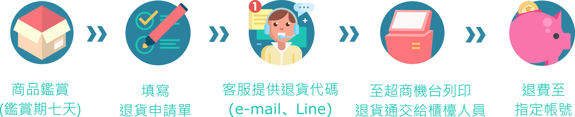 將欲退貨之商品與發票包裝妥當,並至超商之機台列印退貨服務單一併交給超商櫃台服務人員,即可完成退貨手續。